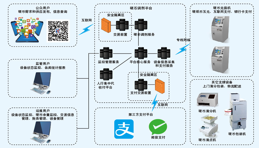 該平臺支持硬幣調(diào)劑服務(wù),通過微信公眾號關(guān)注,即可輕松解決個人及公共交通行業(yè)用戶硬幣存儲難、商業(yè)用戶找零需求量大等難題,降低了人民銀行硬幣投放成本和商業(yè)銀行硬幣回收成本,提升市場上硬幣流通效率,踐行人行硬幣自循環(huán)的政策。