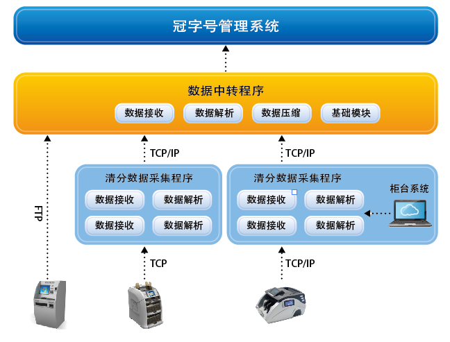 - 業(yè)務(wù)系統(tǒng)無縫對接可與銀行原有相關(guān)系統(tǒng)無縫對接,同步實現(xiàn)與業(yè)務(wù)系統(tǒng)的信息交互,完成冠字號信息與交易信息的綁定。