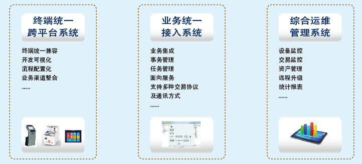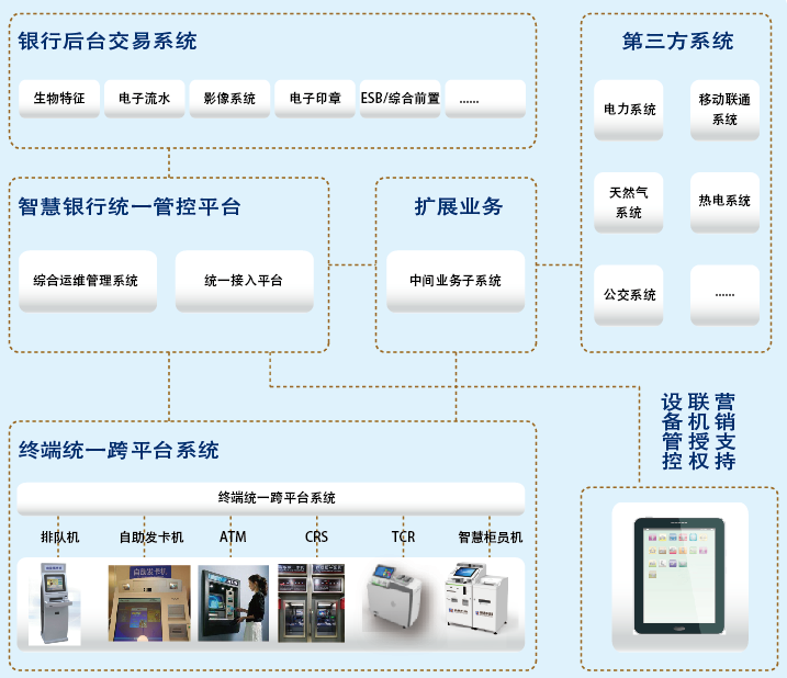 榮鑫科技向銀行客戶提供完整的智慧銀行統(tǒng)一管控平臺(tái)系統(tǒng)解決方案,包括:終端統(tǒng)一跨平臺(tái)系統(tǒng)、綜合運(yùn)維管理系統(tǒng)、業(yè)務(wù)統(tǒng)一接入系統(tǒng),幫助銀行客戶打通線上線下渠道,兼容多廠商硬件設(shè)備應(yīng)用部署,實(shí)現(xiàn)多渠道互通,結(jié)合CRM系統(tǒng)為網(wǎng)點(diǎn)精準(zhǔn)營銷提供平臺(tái)支持。